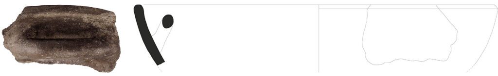 Fragmento de bordo de panela de asa interior modelada ao torno. Forma troncocónica com parede arqueada e espessamento progressivo para o bordo. Bordo espesso com lábio plano e horizontal. Asa interior em forma de um arco de secção circular, de desenvolvimento horizontal, implantada no terço superior da parede, paralela ao bordo.