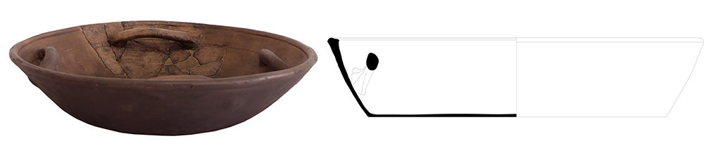 Fragmento de bordo e arranque de parede com asa interna modelada ao torno. Forma troncocónica com paredes arqueadas e espessamento progressivo da base para o bordo. Bordo espesso com lábio plano projetado para o interior ligeiramente descendente. Asas interiores de secção circular de desenvolvimento horizontal, implantadas no terço superior da parede, paralelas ao bordo, a formar um arco. O local de implantação das asas originou pequenas protuberâncias na face externa da parede.