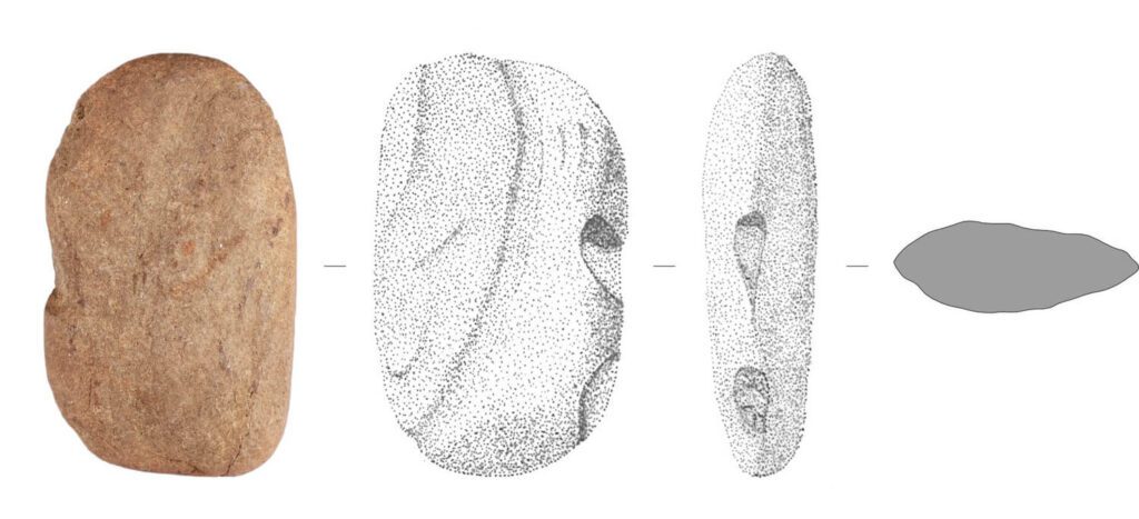 Peso em xisto de tom rosáceo integralmente polido. Recorte oval de secção plano-convexa, assimétrica, com ligeira aresta numa das faces. Apresenta dois entalhes laterais de recorte desigual e levemente descentrados. Faces ligeiramente convexas irregulares. Arestas polidas e cobertas por uma patine lustrosas.