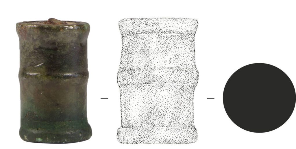Peso de forma cilíndrica com vestígios de anel de suspensão em ferro incorporado na peça e coberto na parte superior por uma fina camada de chumbo. É composto por três molduras localizadas respetivamente na parte superior, na parte intermédia do corpo e no remate inferior.