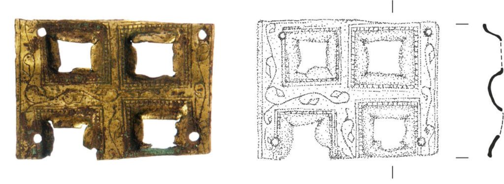 Trata-se de uma placa gravada para encastrar cristais, pastas vítreas ou pedras semipreciosas, cujo contexto arqueológico sugere tratar-se de parte do revestimento da cruz processional ou de altar que integraria a placa esmaltada acima referida.
