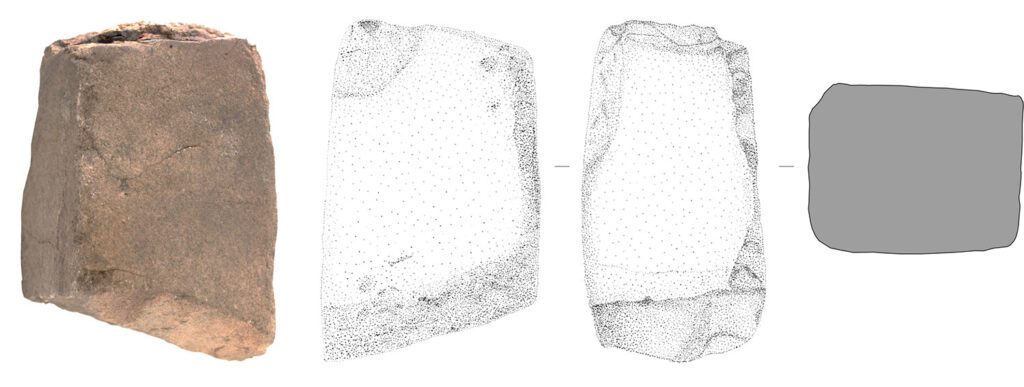 Contorno sub-retangular, irregular de recorte assimétrico. Faces planas e intensamente polidas com faces laterais verticais e arestas arredondadas. Secção subretangular. Polimento irregular e pouco intenso. Extremidades fraturadas.