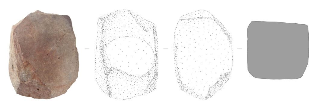 Contorno sub-retangular. Extremidades fragmentadas e irregulares de recorte assimétrico. Faces planas reduzidas e intensamente polidas. Arestas laterais verticais de arestas arredondadas. Secção subretangular.