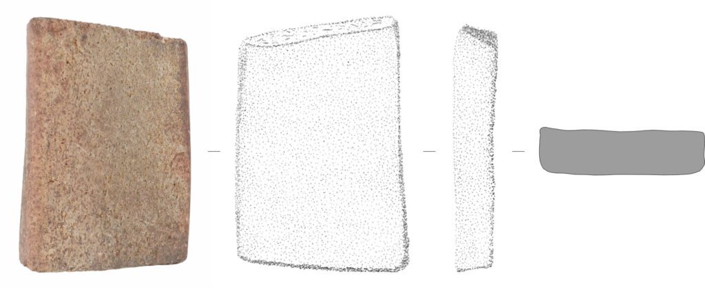 Polidor de formato retangular, levemente irregular, com faces laterais retas e arestas arredondadas, fragmentado em ambas extremidades. Faces integralmente polidas e arestas erosionadas. Superfície com lustre e pátina generalizada.