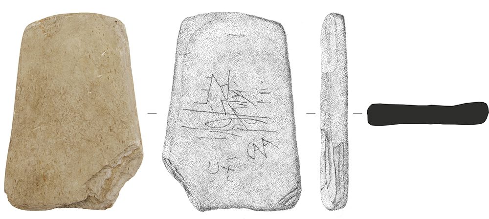 O primeiro – AVE – constitui uma saudação cujo grafito se compõe de um nexo, no qual a letra V é formada pela haste direita do A e pelo elemento vertical do E que se apresenta levemente inclinado à direita. O grafito ocupa a face intermédia, não revelando qualquer alinhamento com o eixo da peça.