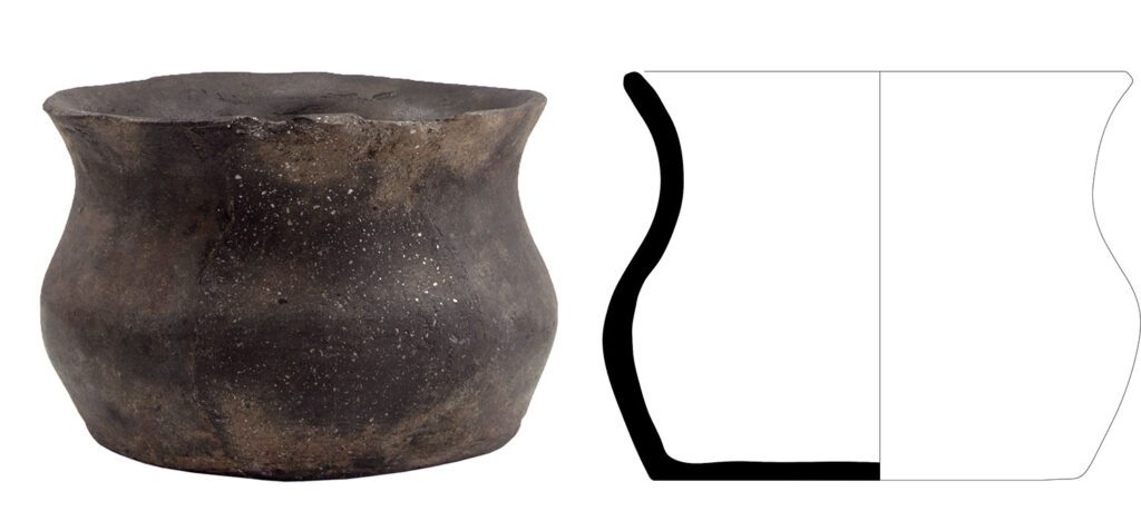Pote modelada ao torno. Perfil em S com parede contracurvada, simétrica, com fundo plano de assentamento pleno. Bordo lançado para o exterior rematado por lábio de secção arredondada. Parede de espessura irregular com espessamento progressivo para o fundo.