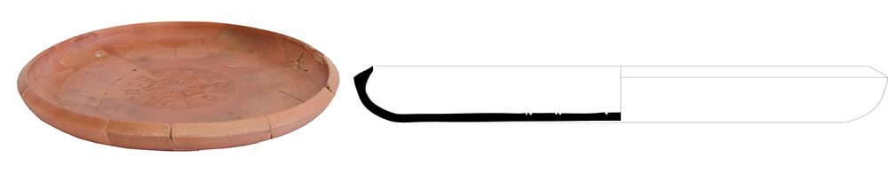 Perfil completo de prato de fundo plano marcado por uma fina canelura a configurar o ressalto para assentamento. Parede curva, reentrante. Bordo com lábio de perfil triangular, pontiagudo, com face externa plana, rematada por uma carena angulosa que marca o início da curvatura da parede.