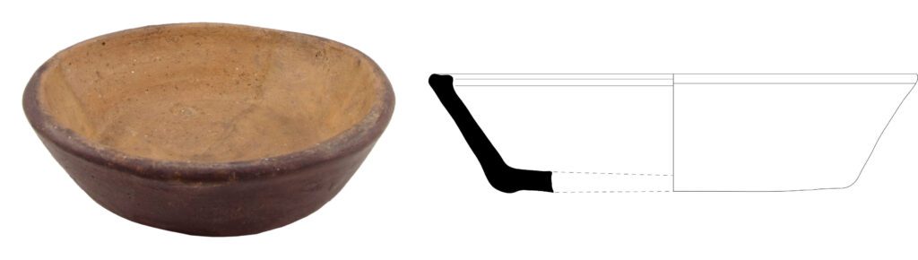 Cerâmica comum. Pasta compacta com cozedura uniforme (N51). Elementos não plásticos de pequeno calibre constituídos por quartzo, feldspato, mica e nódulos ferrosos distribuído de forma homogénea. Superfície externa de textura irregular revelando um polimento mediano com intensos vestígios de exposição ao fogo (T51).
