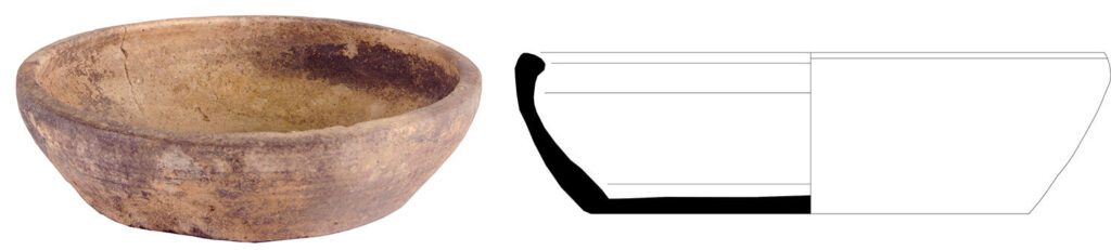 Pratocom paredes arqueadas de desenvolvimento oblíquo. Bordo reentrante e lábio introvertido, ligeiramente facetado na face superior, com espessamento simétrico. Parede de espessura irregular com espessamento progressivo para a base. Fundo plano de desenvolvimento oblíquo de assentamento integral e espessura regular.