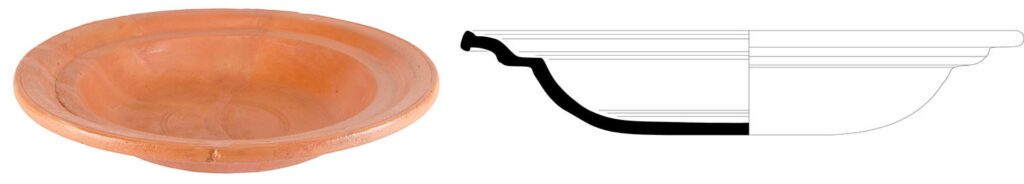Prateira, terra sigillata africana tipo Hayes 67. Paredes arqueadas com aba e bordo moldurado e ascendente. Lábio espessado marcado por um friso interno. Perfil sinuoso com paredes arqueadas e fundo plano marcado por uma estria profunda, formando um pé falso. Apresenta ainda duas linhas concêntricas, paralelas entre si, no fundo interior do prato.