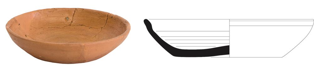 Prato de pequenas dimensões de terra sigillata africana tipo Hayes …. com parede arqueada. Bordo de desenvolvimento vertical com lábio arredondado. Fundo plano, ligeiramente côncavo, de assentamento lateral. Espessamento progressivo para o centro. Decoração composta por um friso de pequenas estrias incisas, paralelas ao bordo, implantadas na face superior da parede.