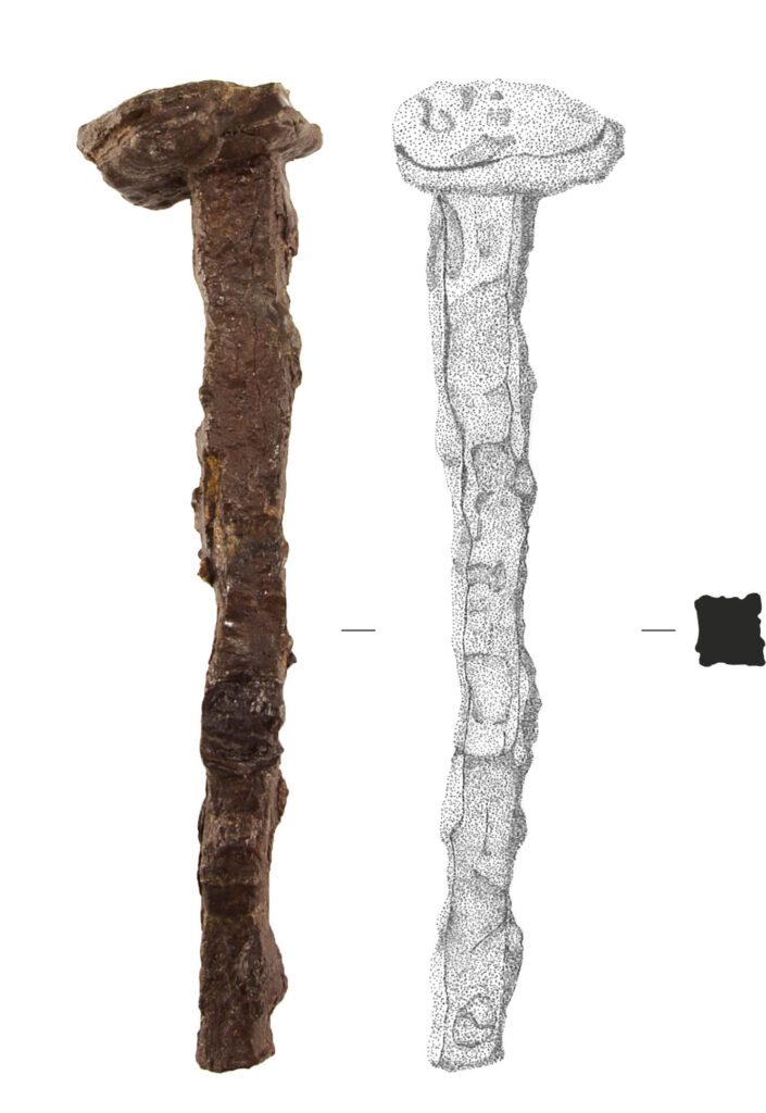 Prego de grandes dimensões. Cabeça circular. Haste de secção quadrangular com estreitamento progressivo para a ponta. Fragmentado ao nível da haste no terço inferior.