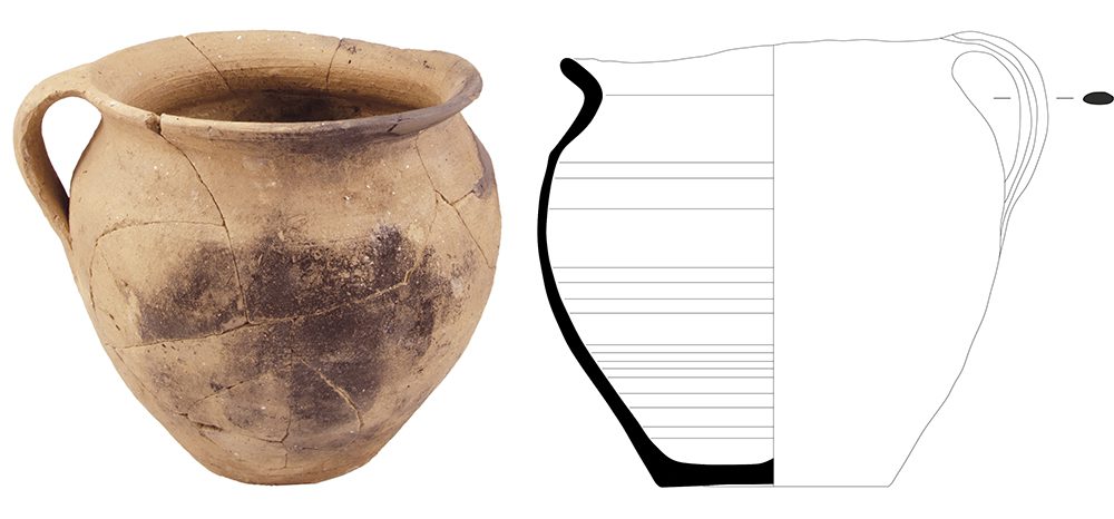 Púcaro de perfil ovóide. Corpo elíptico com bordo projetado para o exterior rematado por lábio arredondado com irregularidades. Parede com espessura irregular com abundantes estrias internas com espaçamento irregular. Fundo plano, ligeiramente côncavo, com espessamento central. Asa de fita com secção plano convexa ligeiramente soerguida em relação ao bordo.