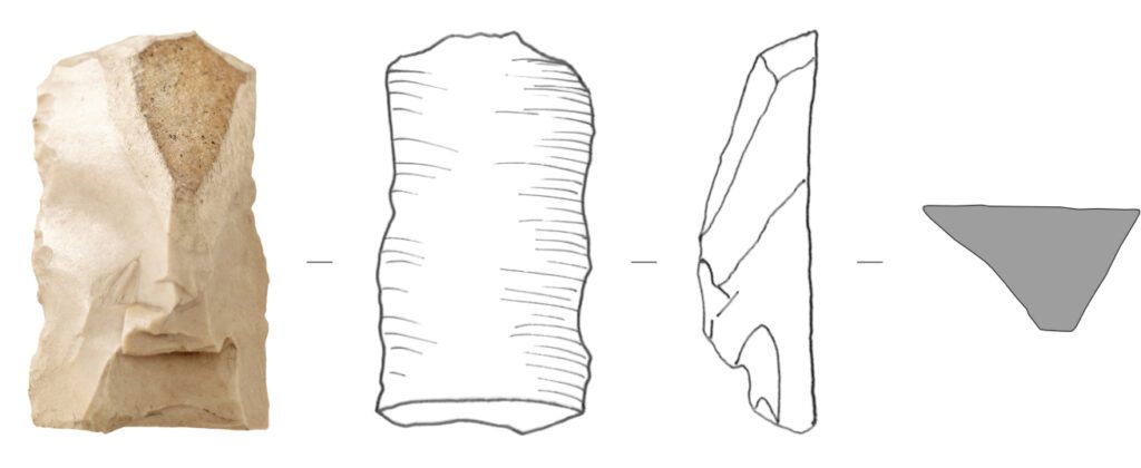 Raspador composto por fragmento de lâmina alongada de dorso preparado com nervura central alteada de secção trapezoidal. Retoque integral, bifacial, marginal e oblíquo. Os bordos foram retocados através de reavivamentos oblíquos diretos. Vestígios evidentes de utilização.