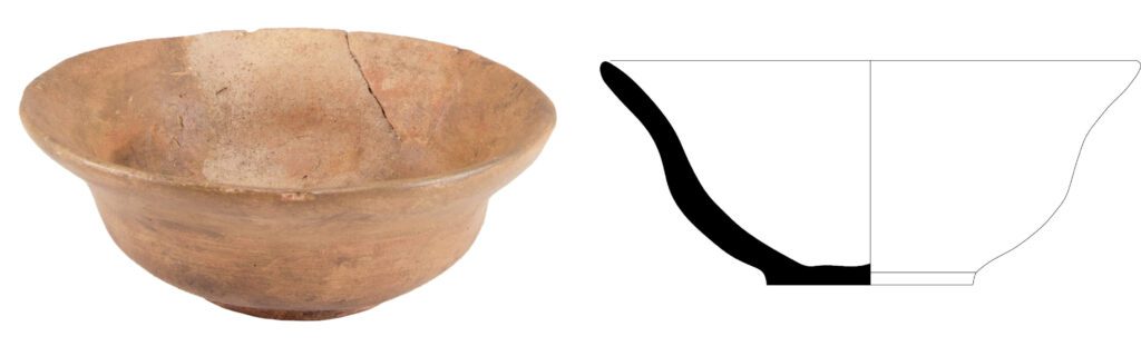 Taça. Perfil sinuoso, em S, pouco pronunciado. Bordo esvasado rematado por lábio pontiagudo virado para o exterior. Fundo com pé discóidal de assentamento pleno.