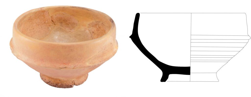 Taça de imitação da forma Dragendorff 24/25 da sigillata hispânica. Bordo vertical, ligeiramente reentrante, de secção arredondada. Parede curva com carena exterior de perfil triangular com espessamento da parede. Fundo com pé ligeiramente aberto e com moldura hispânica. A decoração é composta por um conjunto de pequenos frisos de diferentes espessuras dispostos ao nível inferior da parede.