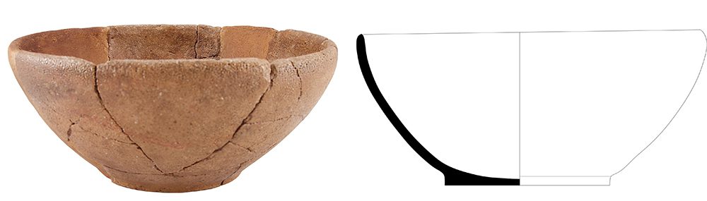Taça de média dimensão. Parede arqueada com bordo vertical e lábio pontiagudo. Fundo formado por pé discóidal de assentamento pleno.