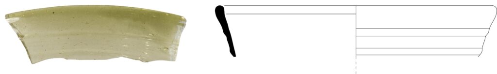 Vidro translúcido de cor verde-musgo (2.56Y6/6), de qualidade média, com vacúolos alongados e impurezas negras. Análise química por espectrometria de fluorescência de Raios X – Amostra de vidro de silicato de cálcio, CaO 11%, manganês 4%, ferro 3%, bário 3%, isento de chumbo e estanho.