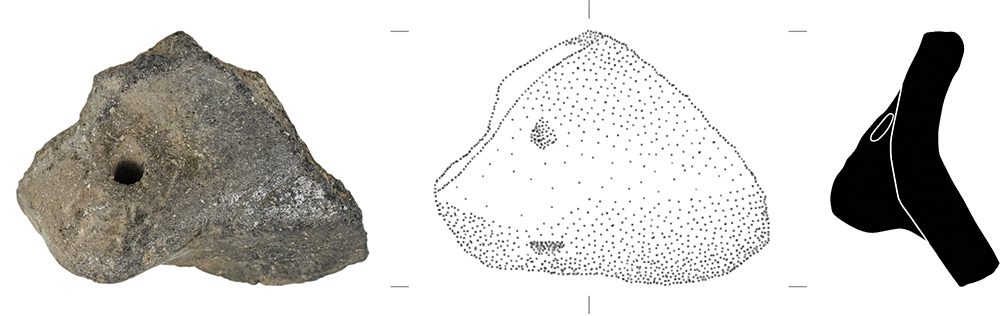 Fragmento de parede e asa de taça carenada de modelação manual. Asa perturbante de formato subtrapezoidal com perfuração lateral.