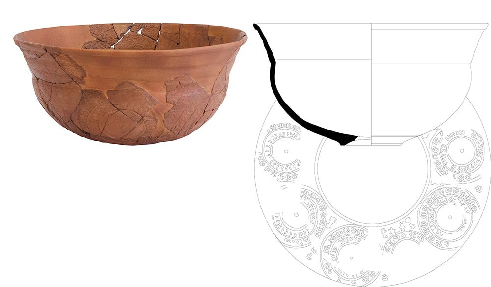 Taça tipo Dragendorff 37B (Tardia), decorada com o 2º estilo decorativo. Perfil acampanado com parede estruturada em dois planos, compreendendo o primeiro o reservatório e, o segundo, a parede do bordo que se apresenta reta de desenvolvimento oblíquo. O bordo remata com um lábio de perfil arredondado de secção oval. O fundo é formado por um falso pé, baixo e curto, de desenvolvimento anelar com assentamento radial com moldura típica dos produtos do vale do Ebro (MAYET 1984, 257). A decoração ocupa apenas a face intermédia e inferior do reservatório e apresenta-se inscrita numa banda paralela ao bordo. Os motivos compreendem círculos separados por bastões. Os círculos apresentam duas bandas internas nas quais se inscrevem crescentes, intervalados por pontos. A composição não é simétrica, sendo o remate composto por um círculo de menor dimensão.