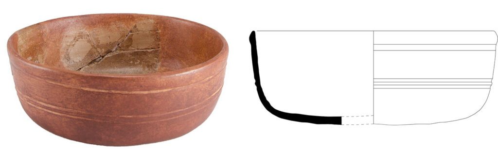 Taça de pequena dimensão. Fundo plano de assentamento direto, com paredes verticais rematadas por lábio amendoado. Elemento decorativo constituído por canelura a meio do bojo.