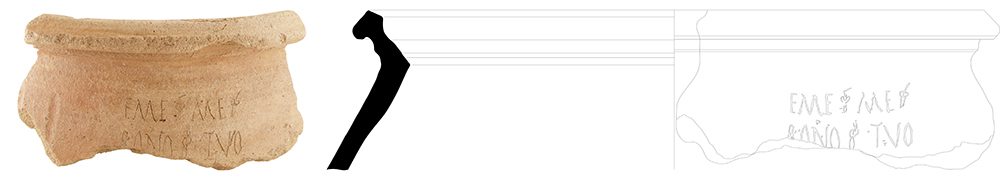 Fragmento de bordo e arranque de parede de talha de corpo elíptico. Bordo esvasado de perfil anguloso. Forma duas faces planas divergentes, vincadas por uma carena interna localizada imediatamente abaixo do lábio. No exterior forma uma aba rebaixada com os cantos arredondados. Na separação do arranque da parede com o bordo forma uma carena interna pronunciada e de perfil anguloso. Na parte superior da parede conserva um grafito que permite a sua leitura completa. EME / ME / BONO / TUO (Toma-me para teu bem).