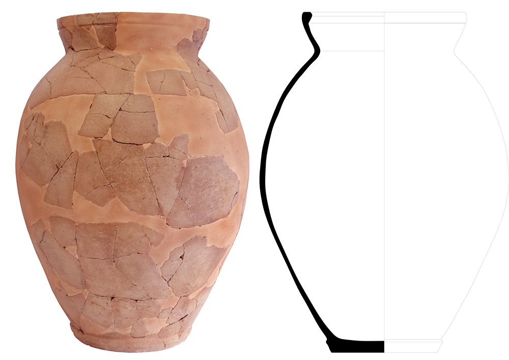 Talha de pequenas dimensões. Bordo espesso de secção triangular com face superior plana. Colo alto, aprumado, com ligeira curvatura para o interior. Ombros arredondados formando um perfil elíptico no bojo. Ângulo obtuso a demarcar o colo da parede do bojo formando uma carena interna. Fundo plano, horizontal, de assentamento pleno.