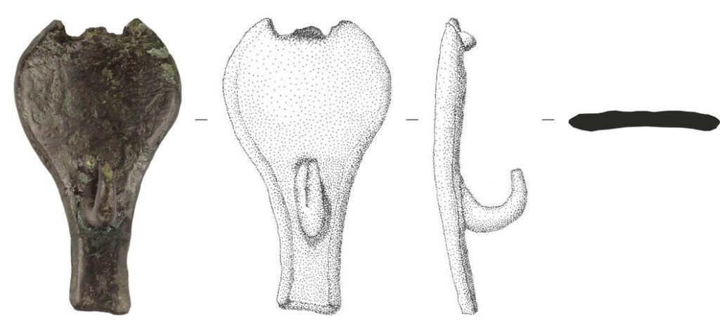 Tampa maciça de jarro lagoena. Tampa de formato periforme articulada por uma pequena charneira perfurada através de um eixo com duas outras implantadas no bordo. Na parte superior, onde se inicia o estreitamento para o bocal, possui um gancho que permitiria abrir a tampa do jarro e assim, mantê-la durante o ato de servir. Os jarros de bocal em bico constituem peças de mesa destinadas a servir água ou vinho (HILGERS 1969, 230), constituindo uma forma muito difundida nas províncias romanas,