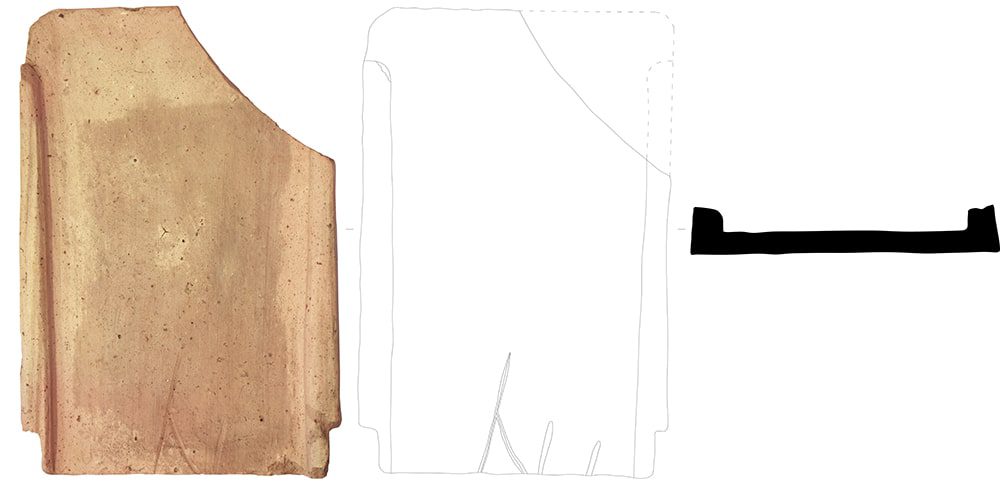 Tégula. Formato sub-rectangular de rebordo decrescente com encaixe superior com interrupção do rebordo e encaixe inferior de tipo universal. Rebordo com contorno trapezoidal com aresta interior suavizada. Superfície plana, ligeiramente empenada. Encontra-se fragmentada no canto superior direito.