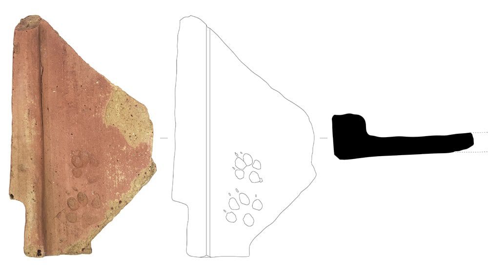 Fragmento de tégula. Formato sub-rectangular de rebordo decrescente com encaixe inferior de tipo universal. Rebordo de contorno trapezoidal com aresta interior suavizada. Superfície plana, ligeiramente empenada. Conserva-se apenas um terço do seu comprimento máximo. Regista duas pegadas de um felino, provavelmente de gato, produzidas durante o processo de secagem.