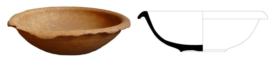 Tigela de paredes arqueadas com bordo formado por aba curva e pendente, de perfil arqueado. Corpo arredondado, ligeiramente assimétrico, com fundo plano de assentamento direto levemente côncavo.