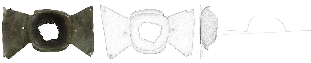 Umbo de escudo elaborado através de martelagem a partir de uma só folha, com parte central esférica, fragmentada no centro. Aletas de perfil trapezoidal, com orifícios nos vértices para fixação com cravos.