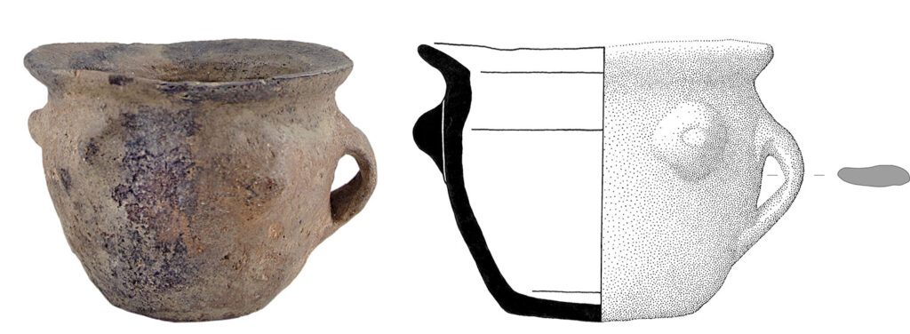 Vaso de modelação manual de perfil subelítico com inflexão acentuada ao nível do bojo. Fundo plano-convexo. Bordo formado por aba curta de orientação oblíqua com lábio arredondado. Asa lateral de desenvolvimento vertical, de secção retangular, implantada ao nível intermédio da parede. A decoração é composta por cinco saliências circulares de perfil subelítico “mamilos” implantados na face superior do bojo.