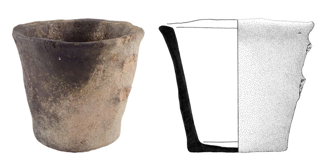 Vaso de modelação manual de perfil subelítico ligeiramente contracurvado com estrangulamento ao nível da face inferior do bordo. Lábio de secção trapezoidal com face superior plana. A parede regista os negativos de implantação de uma asa de desenvolvimento vertical.