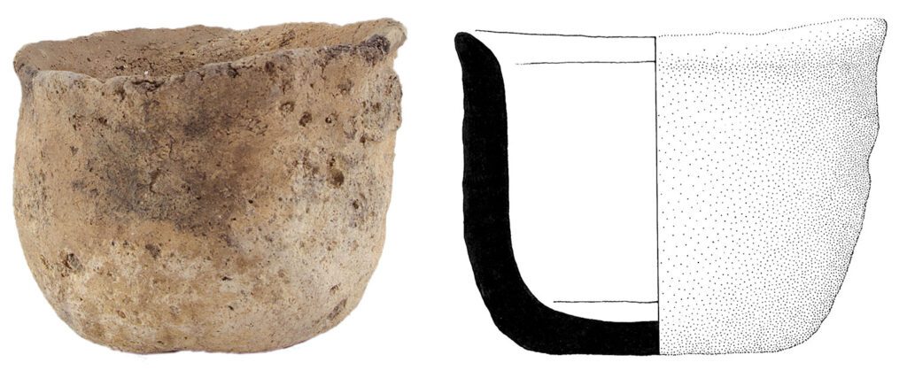 Vaso de modelação manual de perfil troncocónico ligeiramente sinuoso. Fundo plano. Bordo vertical de secção triangular. A parede revela negativos de implantação de uma asa de desenvolvimento vertical e secção plano-convexa.