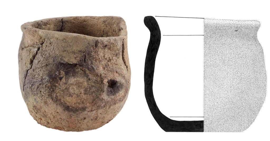 Vaso de modelação manual de perfil troncocónico, levemente sinuoso. Bordo vertical com face plana e lábio de perfil pontiagudo projetado para o exterior. Paredes verticais de espessura irregular. Fundo plano e espesso, ligeiramente convexo. A parede regista os negativos de implantação de uma asa de desenvolvimento vertical.